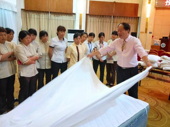 中心全体员工对唐老师的讲座内容表现出了浓厚的兴趣,特别是下午针对客房部的中式铺床——中式铺床的方法、操作程序、操作要领、操作标准及要求,着重演示了铺床的操作方式,如飘单、抖单、连飘带抖、抛单,以及它们的区别和注意事项,然后演示了包角、套被套、装枕头以及操作技巧。员工还纷纷上去现场演练,即学即用。通过培训使员工了解到更多的操作方法与操作技巧,从而在实际工作中不断提高效率及水平。员工们纷纷表示这样的知识讲座非常意义,大家受益匪浅。