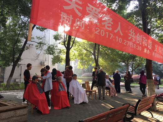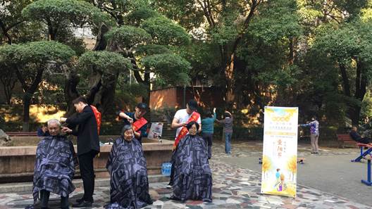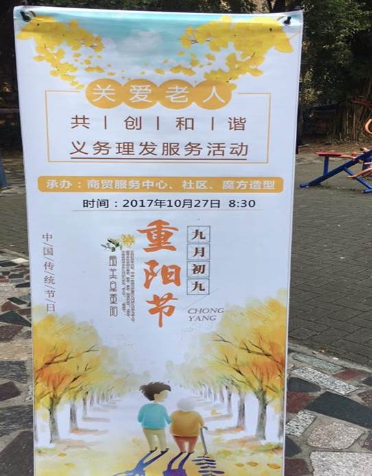 2017年10月27日上午,乘着十九大胜利闭幕开创新时期的东风,又迎来一年度重阳节,商贸服务中心携手社区及魔方造型以六年的坚持行动,本次又以“关爱老人 共创和谐”为主题,同时也为了更好的做好服务,为校区的所有老年同志分别在校园北区花园、东区教工超市旁开展了提供方便、优质、实惠免费理发活动。