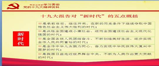 中心仇琦书记在党课上,从七个方面即:新时代中国特色社会主义的深刻变革、新时代中国特色社会主义的伟大实践、新时代中国特色社会主义的理论指导、新时代中国特色社会主义的基本方略、新时代中国特色社会主义的战略安排、新时代中国特色社会主义的行动纲领、新时代中国特色社会主义的坚强领导,进行了详细解读。使同志们深刻理解了党的十九大报告提出的新时代中国特色社会主义思想以及新时代中国特色社会主义思想的八个明确、十四条基本方略、九个方面理论分析和政策指导。为我们对党的十九大提出的新时代、新思想、新目标,“不忘初心、牢记使命”高举中国特色社会主义伟大旗帜,决胜全面建成小康社会、夺取新时代中国特色社会主义伟大胜利,实现中华民族伟大复兴的中国梦明确了行动指南。