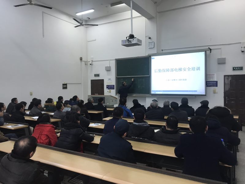 2017年12月15日下午2时至5时,物业服务中心电梯安全监管小组组织物业、宿管、接待、培训中心,以及外包物业公司共45人,在九号教学楼9101教室进行了电梯安全培训,培训分为理论培训和实际操作两个部分。