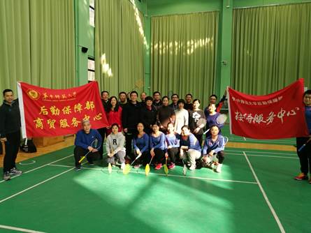 2018年1月17日下午,桂子山乒羽馆内,在后勤保障部李丹、熊妮丽两个分管部长的大力支持和积极参与下,商贸服务中心和接待服务中心举办了一场精彩绝伦的羽毛球友谊赛。大家在热烈友好的气氛下赛出了风格、赛出了友谊,增加了团队精神和凝聚力。