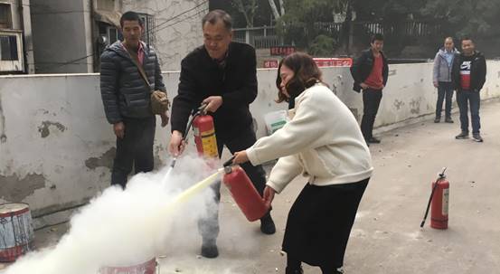 会后,田警官带大家来到楼下开阔地段,演示如何正确使用消防器材,并逐一耐心指导。
