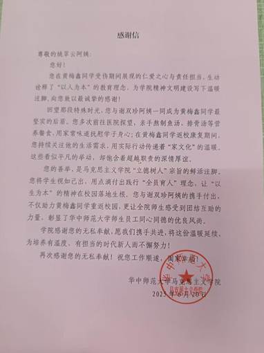 华大后勤讯(通讯员 张凯)6月20日,马克思主义学院黄梅鑫同学给学生宿舍国交1栋的值班阿姨送来了一封感谢信。