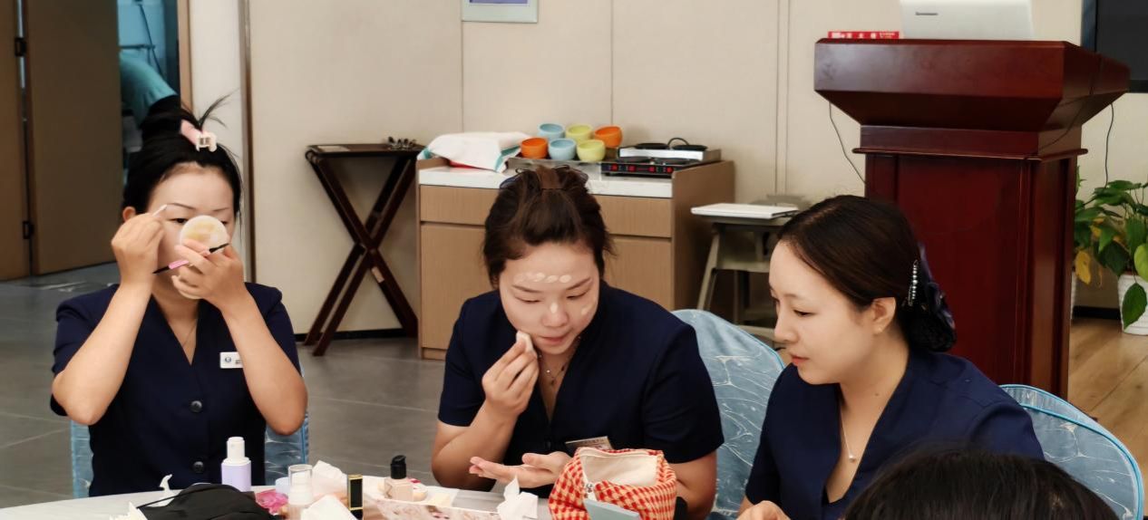 练习环节中,大家热情参与、互帮互助,在尝试中熟悉化妆品的使用手法,在交流中分享个性化化妆心得,现场氛围轻松而积极。活动还结合中心实际,再次明确了工装穿着规范与仪容仪表标准,强调每一位员工的形象都是服务中心“第一印象”的重要组成部分。