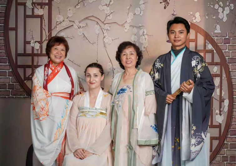 文化讲解结束后,活动进入互动摄影环节。在专业镜头前,大家换上心仪的汉服,相互整理衣冠,结伴走向精心布置的古风场景。来自也门的阿马尔同学兴奋地说:“穿上汉服,让我感觉自己真正触摸到了中国历史,这比看书更震撼!”留学生们或执扇浅笑,或拱手作揖,社区党员陈老师则在一旁细心指导动作,现场欢声笑语不断。光影不仅记录下身着汉服的风采,也定格了不同文化背景居民友好互动、其乐融融的珍贵画面。