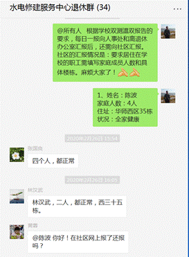 在这非常时期我中心办公室的陈波同志始终处于工作一线,每天早上10:30之前摸排登记和上报在职教职工和退休职工及家属的身体健康情况,及时完成上级部门所有要求上报的各项信息。每天接龙,天天汇总限时上报,为上级部门落实防控提供精准的第一手资料和信息。在完成单位所有职工的健康检查工作后还要收发口罩、防护物质,不定时地为水电保障部门的工作人员购买消毒用品并提供一些力所能及的安全保障。