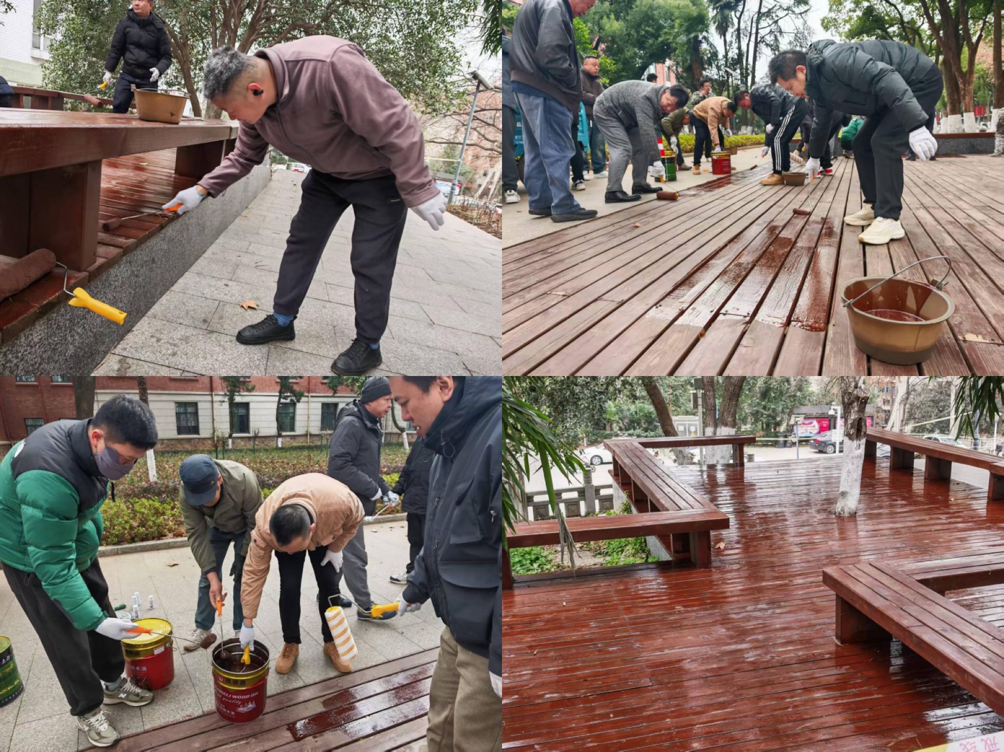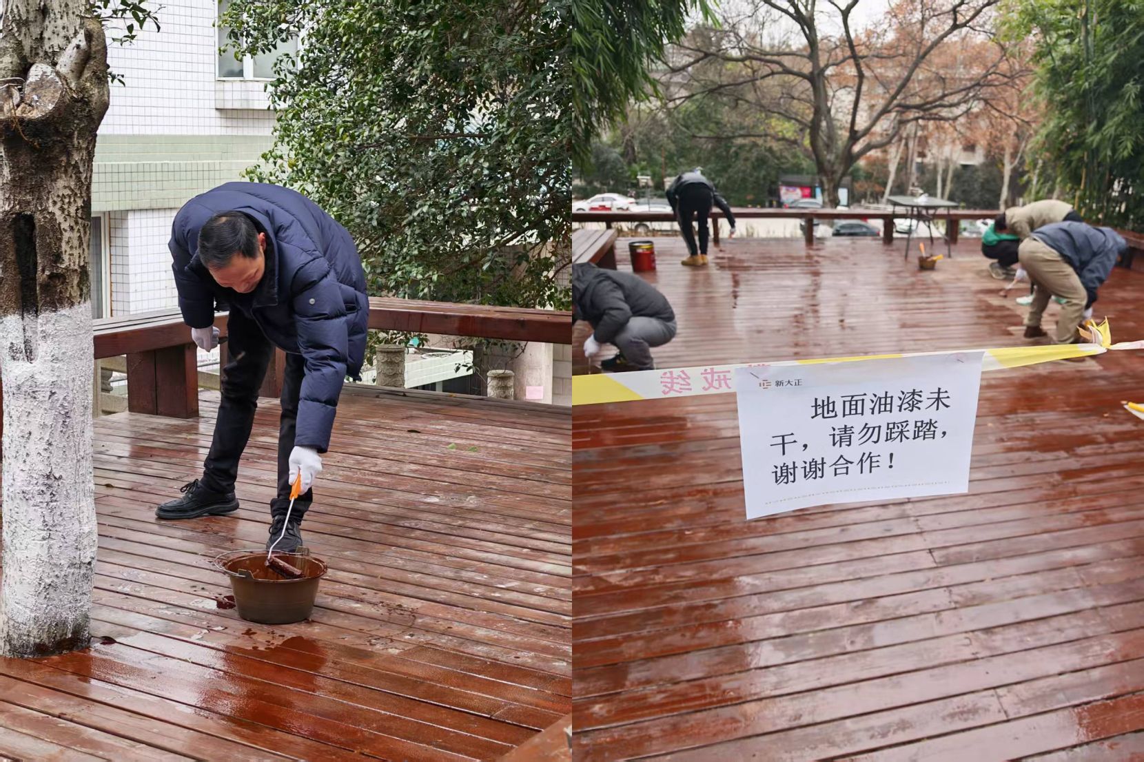 当日下午,外包物业公司提前完成栈道清洁及拉设警戒线等准备工作。随后,两中心 20 余名员工分工协作,对行政楼门口、桂香园旁丹桂亭木制栈道及座椅扶手等设施进行刷漆养护。能源保障与维修服务中心的党员充分发挥先锋模范作用,高质量完成所承担任务。