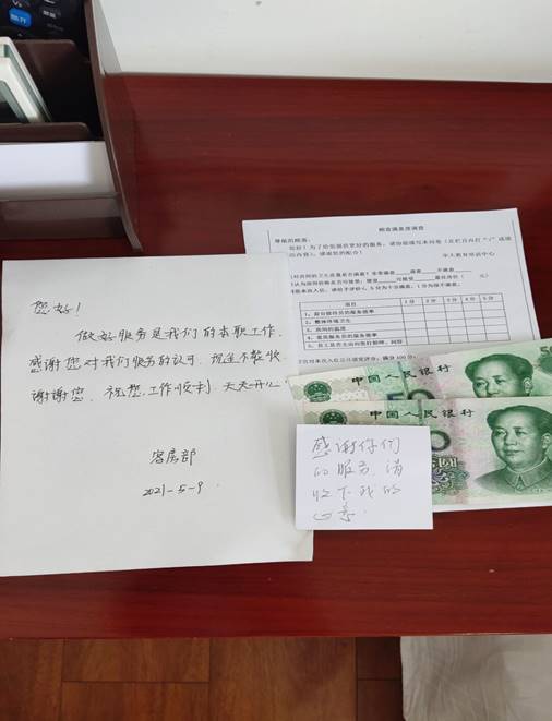 “不忘初心,牢记使命”是培训中心员工的思想指导和行动指南,5月9日,培训中心服务再次深获客人好评,客人甚至拿出现金作为对服务的高度赞扬,中心拒收现金并回信表示感谢。