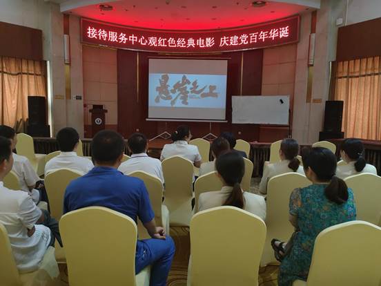 庆祝中国共产党成立100周年,重温红色记忆,传承革命意志,继承和发扬党的光辉传统,6月28日,接待服务中心在桂苑宾馆多功能厅放映红色系列影片《悬崖之上》、《建党伟业》、《生命重于泰山》……,员工们积极观影。