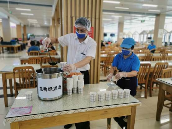 “同学,免费绿豆汤可以续杯喔!”食堂经理一边给同学分发绿豆汤,一边微笑提醒。