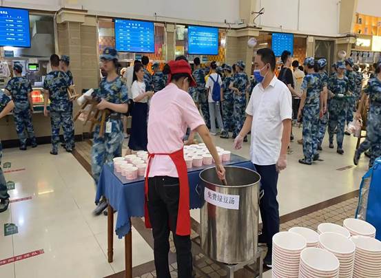 饮食服务中心相关负责人表示,军训期间保证免费绿豆汤供应充足,天气炎热,加强食材保鲜储存,提供可口的饭菜和优质的服务,为学校军训提供强有力的餐饮保障。