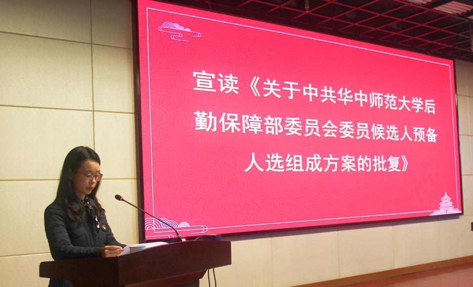 胡余映同志宣读《关于中共华中师范大学后勤保障部委员会委员候选人预备人选组成方案的批复》。