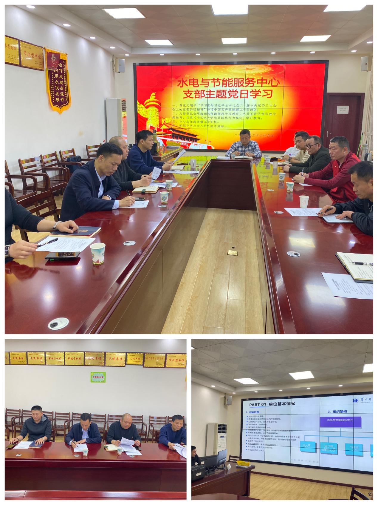 2024年3月29日下午,水电与节能服务中心支部书记金质海主持召开主题教育学习会,中心全体在职党员和骨干参加,分党委书记王军、专职纪检员费克文同志全程指导,并对中心工作进行调研。