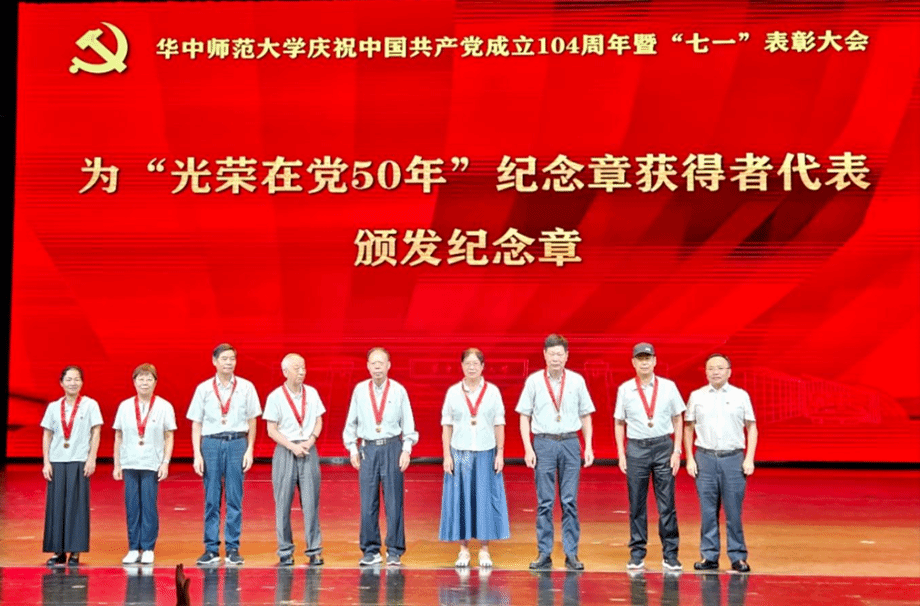 段荆陵等七位老同志获“光荣在党50年”纪念章,校党委书记夏立新为获得者代表颁发纪念章。闵金元同志作为老职工代表上台领取纪念章。这些老党员用半个世纪的党龄诠释了对党的忠诚,为后勤年轻一代树立了精神标杆。
