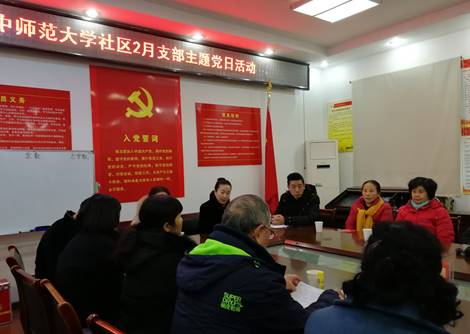 社区党委深入学习贯彻习近平总书记视察湖北重要讲话精神,认真做好基层党组织“两学一做”教育学习活动。2月14日,华师大社区党委在社区会议室开展了2019年2月份的支部主题党日活动,全体党员参加了会议。