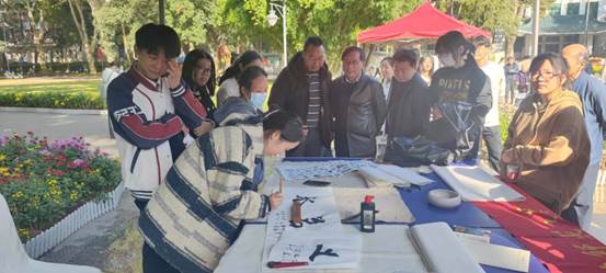 活动期间,观众们除了欣赏各种造型各异的菊花和精彩的文艺表演外,还特设了6片书画展示区,师生们可以与学校老教授协会、南湖书画协会的专家学者进行面对面的交流,共同分享他们的书画经验和技艺,展示区里老中青三代人同台交流、互相学习、共同进步,让大家感受到文化的传承和发展,以及艺术的魅力。