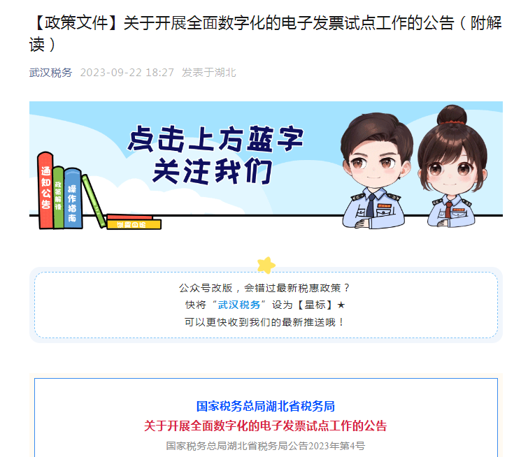 为落实中办、国办印发的《关于进一步深化税收征管改革的意见》要求,加大推广使用全面数字化的电子发票(以下简称“数电票”)力度,经国家税务总局同意,决定在湖北省开展数电票试点工作。自2023年10月1日起,在湖北省的部分纳税人中开展数电票试点。
