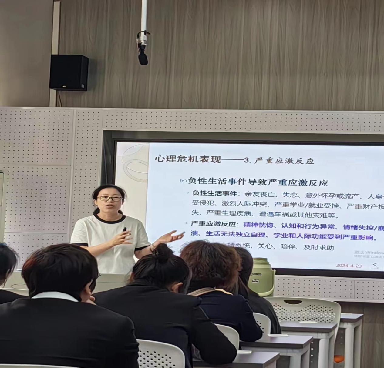 4月23日,学生宿舍服务中心联合学工部举办了一场面对宿管员的心理健康教育培训活动,旨在帮助宿管员提高心理危机识别意识和应对能力,便于更好的开展学生服务工作。此次活动专门邀请了华中师范大学心理健康教育中心副主任于丽霞老师担任主讲,学生宿舍服务中心主任陈岚、各站区站长以及50余名宿管员参加了本次培训。