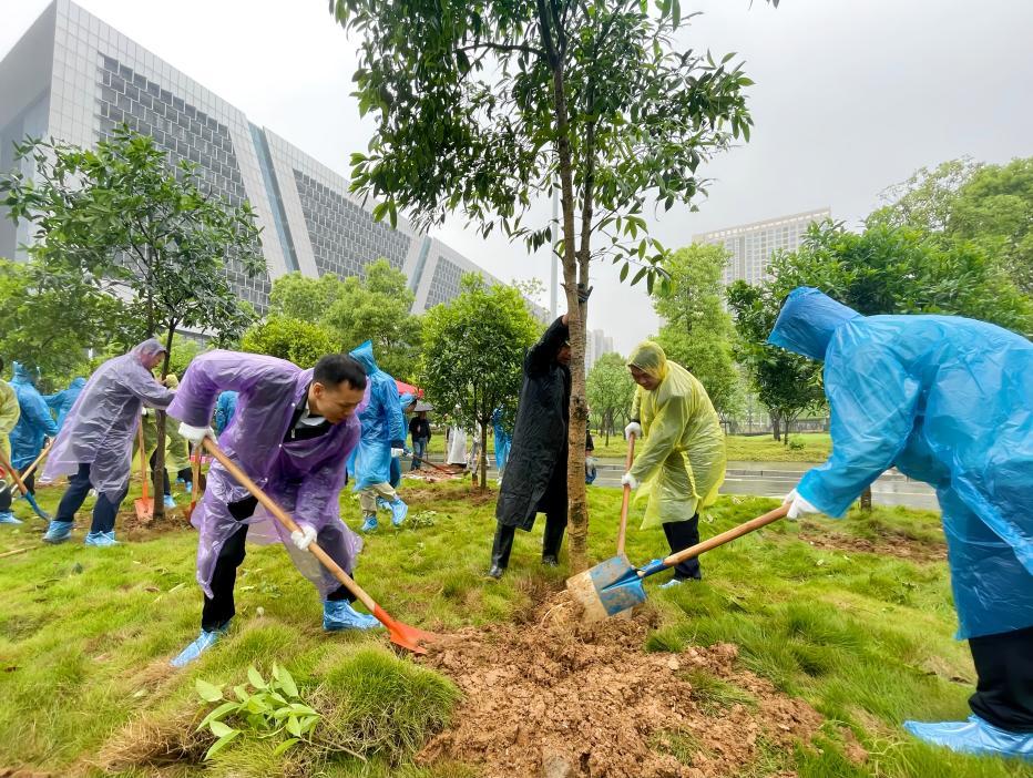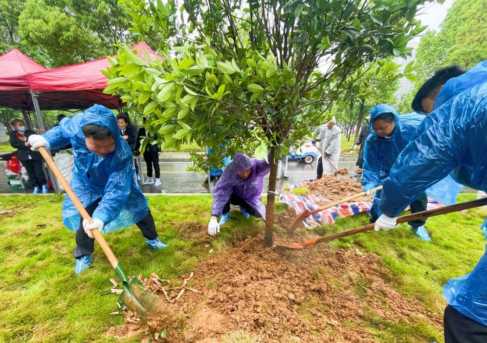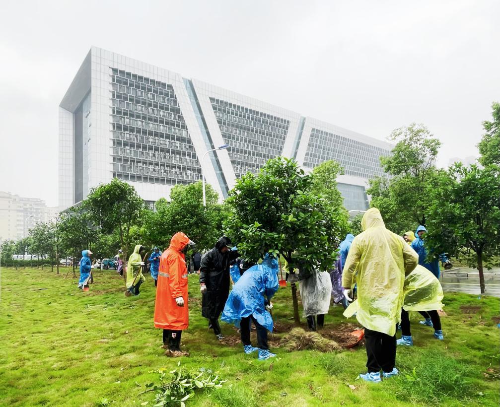 活动伊始,大家纷纷穿上雨衣,带上手套,拿起铁锹,投入到紧张而有序的植树劳动中。虽然天公不作美,但通过分工协作,互相配合,一棵棵新栽的树苗昂然挺立,为校园增添了一抹新绿。