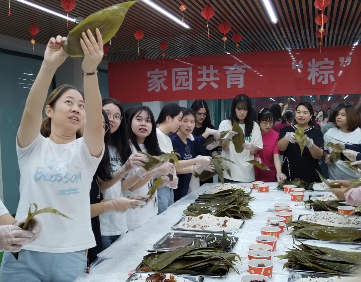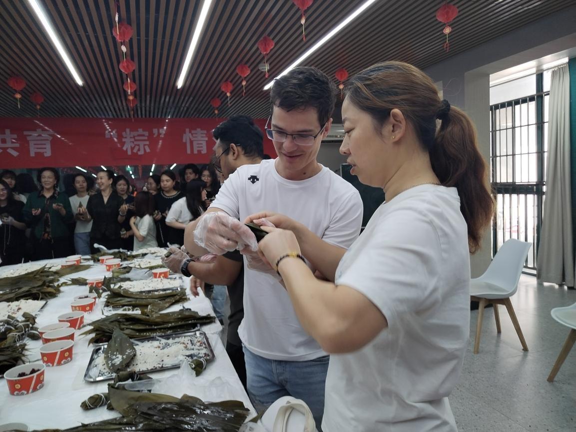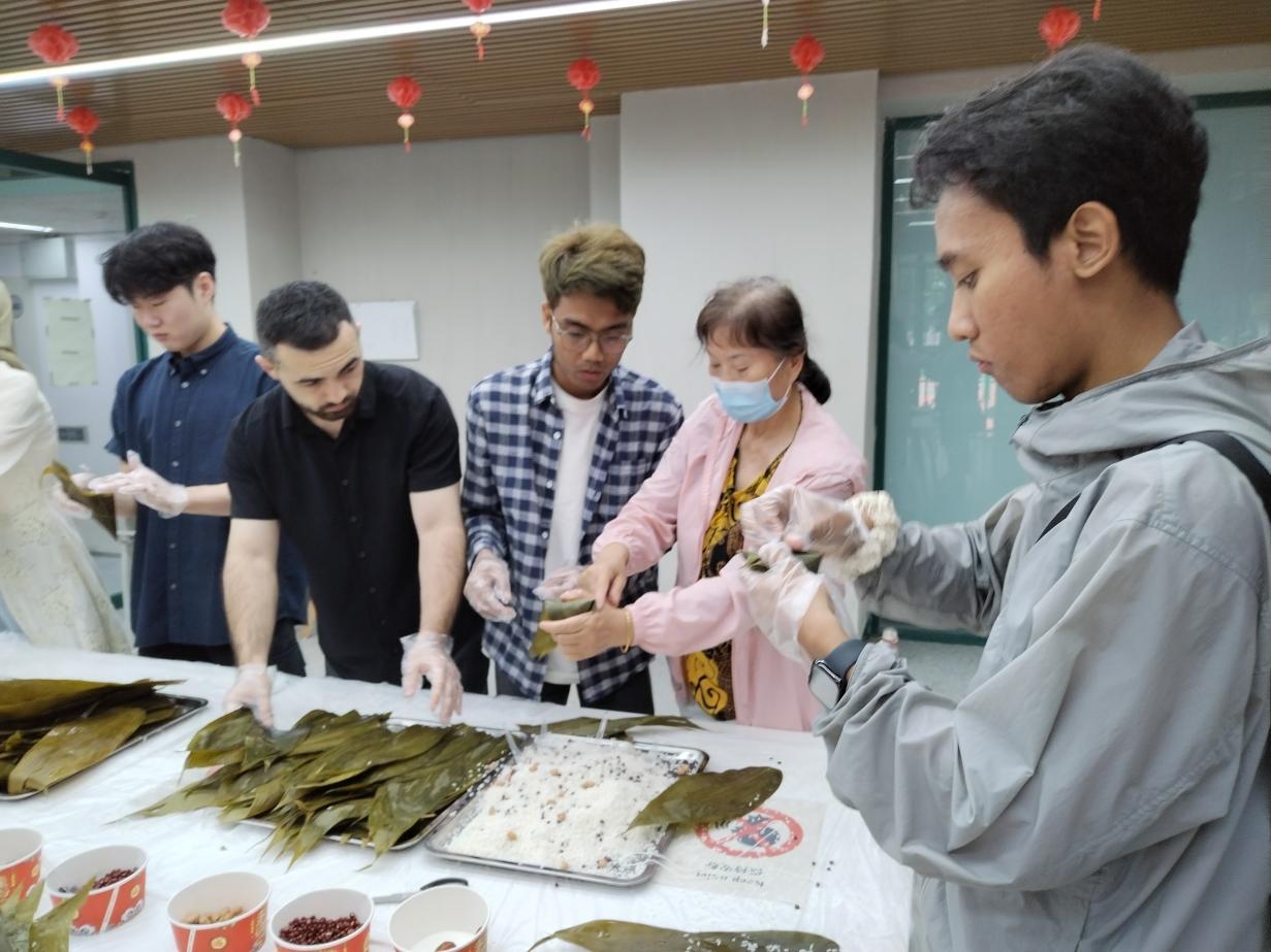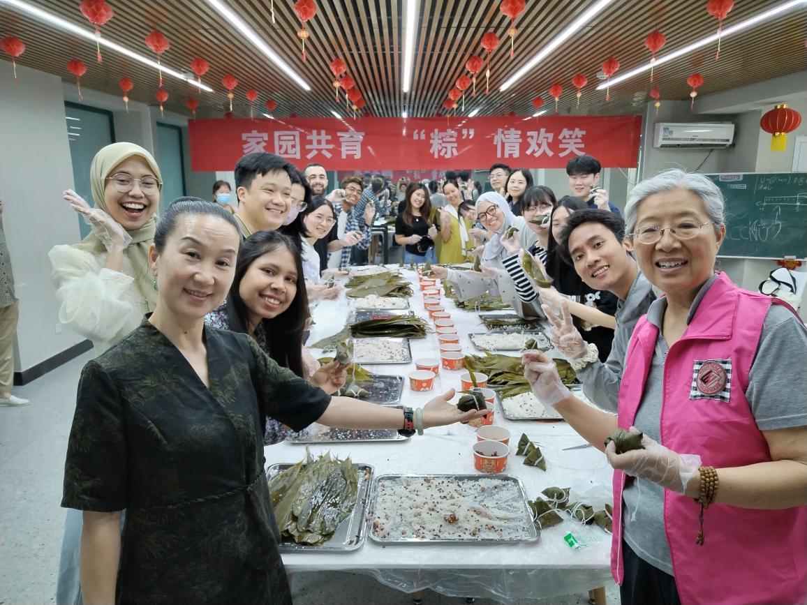 “老师,您看看我这个粽子包的好吗?”“今天的活动太有意义了!我们包的粽子可以带走吗?”“这是我第一次包粽子,真是看着简单操作难,不过还是挺有趣的!”留学生们积极交流互动,工作人员们热心指导,现场氛围快乐又温馨。粽子制作完成后,学生们骄傲地拿着自己包的粽子向同伴展示,并表示他们感受到了国际化社区开放、包容的文化影响力,也通过此次活动享受了一段轻松惬意的初夏时光。