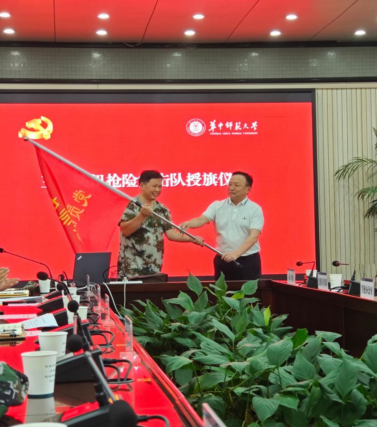 后勤保障部部长袁本芳详细汇报了物资储备和人员调度的准备情况。防汛抢险突击队代表龚启学表态发言。校党委书记夏立新向突击队授旗。