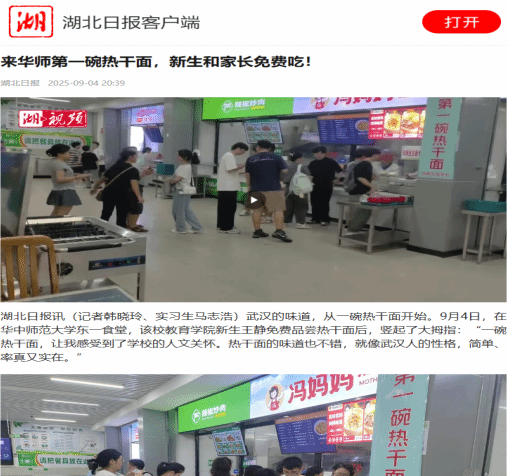 生活配套提质升级,商贸餐饮多元保障。学子超市与南湖超市经暑期改造,实现仓储分区、空调与保鲜设备升级。商贸发展中心在各校区设4个迎新服务点,提供床品、日用品等200余种商品“一站式”采购,并联合企业开展“凭通知书领水”“商品大酬宾”等活动,切实缓解新生“井喷式”采买压力。餐饮方面,东一食堂推出“新生首碗热干面免费”活动,3天发放餐券超3000张;南湖食堂新增13个风味档口,三楼设置明厨亮灶自助餐区,日均接待800人次,以安全、多元和地域特色餐饮赢得新生首肯。