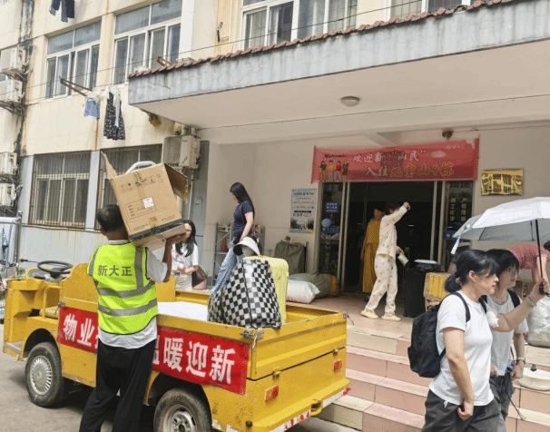 宿舍入住高效有序,传递迎新后勤温度。作为新生报到“第一站”,宿舍管理与物业服务中心提前优化流程,将登记、钥匙发放、设施查验压缩至10分钟内完成。党员组成“寓见服务队”驻扎12栋新生楼,提供“一对一”行李搬运、答疑及入住指引,累计协助搬运行李1200余件,发放资料万余份。运输调度员与驾驶员连续12小时高温坚守,全程跟踪、统筹协调,筑牢“安全温暖线”。