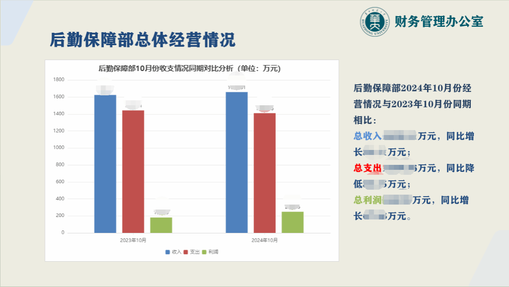 “十四五”期间,财务管理办公室在后勤保障部党政的坚强领导下,在学校财务处的有力指导下,紧紧围绕学校中心任务及后勤保障部发展战略,立足财务管理工作实际,全面履行财务管理与监督职责,为保障后勤各项事业持续、健康、高质量发展提供了坚实的财务支撑。