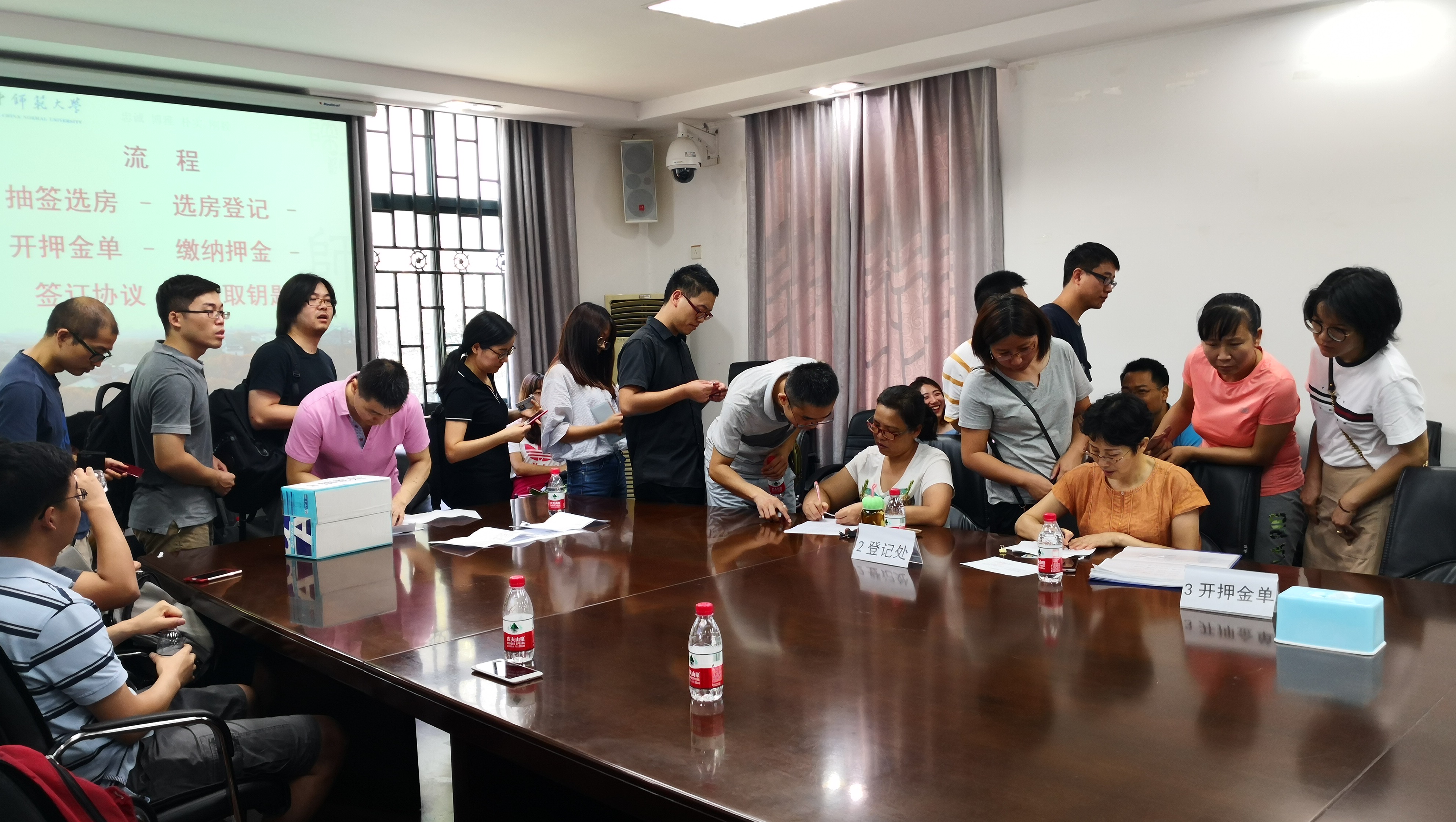 9日的集中安置中,为保证安置工作的公平公正,安置工作采取房源向全体老师公开、所有老师现场抽签选房的方式进行。早晨七点,房产管理办公室全体工作人员就早早的来到现场进行现场准备工作,财务办公室也派出工作人员到现场为老师办理房屋押金现场收缴工作,尽可能的为青年职工提供方便,让老师尽量少跑路,将选房、缴纳押金、签合同、领钥匙等环节全部搬到现场,为青年教师们提供一站式服务。