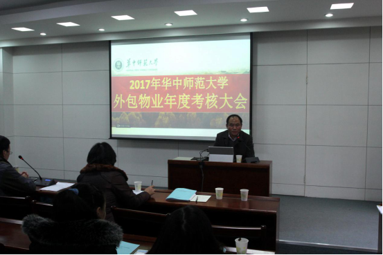 为提高学校外包物业服务质量,12月28日上午9:00,2017年度华中师范大学外包物业考核大会在科学会堂201室举行,湖南美中环境物业管理有限公司、深圳深华物业集团有限公司、武汉天立物业管理有限公司、武汉富丽达物业管理有限公司等四家物业服务企业依照程序接受年终考核。学校相关职能部门、教学科研等22个单位代表、学生代表、监管单位后勤保障部共60多人参与了考核测评。