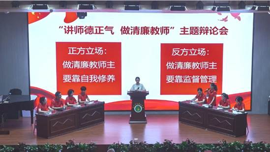 如何让廉洁文化在校园“生根”,营造清风正气的校园环境。教师马瑨恺以微党课的形式为大家讲解了在教学工作中教师应该如何崇廉尚行。8名教师围绕“做清廉教师,主要靠自我修养还是监督管理”展开了激烈辩论。双方各执一词,不时碰撞出思维的火花,赢得台下阵阵掌声。