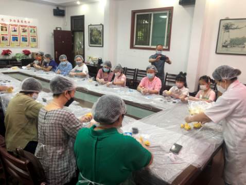 第三个环节是今天活动的重头戏:学做绿豆糕。糕点师介绍绿豆糕制作顺序:绿豆泡水、去皮、控水、蒸熟、加油和糖炒熟等等,接着大家戴上一次性帽子、手套和围裙,打开桌上已分发的袋装绿豆粉半成品,按照授课内容,将散粉揉成团、再揪成若干等份的剂子,分别放入模具中压实、倒出,装盒再封袋,一枚枚漂亮又精致的绿豆糕就闪亮登场啦!