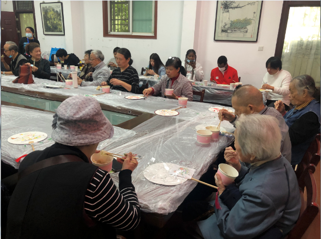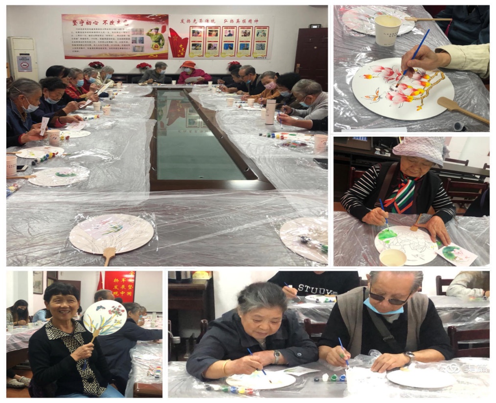 接着,开始活动的第一个内容:手工描画扇子。每人桌面上摆放了一把竹柄有流苏的白色圆扇,扇面上有白描花草图案,分别是玉兰、兰花、荷花等传统吉祥图样。老人们拿着画笔,对照着参考图片上的色彩,蘸好颜料,细心地在白描图案上涂抹颜色。老人们讨论着颜色搭配、调制,一边认真地互相学习,社区工作人员不停地帮老人们换洗笔水,一边热心地提供色彩建议。经过一个小时的努力,一把把扇子先后描画完成。老人们拿着画好的扇子,喜笑颜开,说这是第一次画画,不在于技术好坏,快乐才是最重要的。