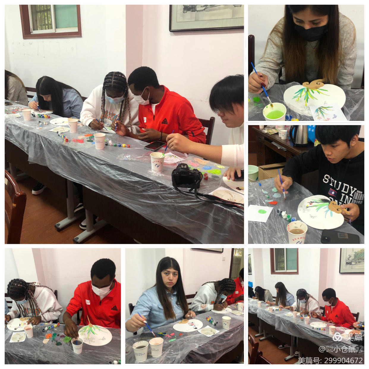 由于作品难度大,集体合影时,留学生唐瑞、阿布、Ishovr DILBER三人的手工扇面还没有完成,表示带回宿舍再继续。