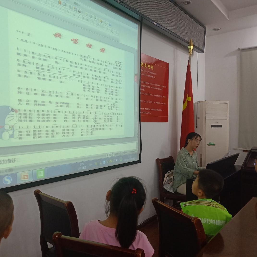7月10日下午,中南民族大学的大学生志愿者郭筱希同学给小学员们上了一堂音乐课,课程由介绍《歌唱祖国》的创作背景以及歌曲学唱两部分组成。