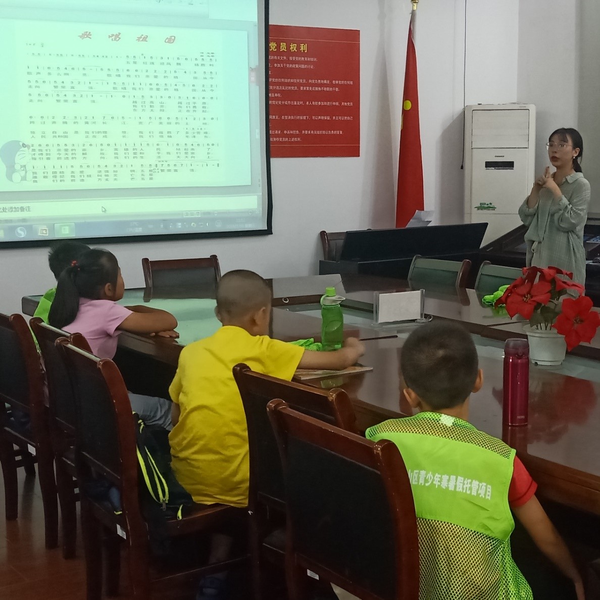 “五星红旗迎风飘扬,胜利歌声多么响亮;歌唱我们亲爱的祖国,从今走向繁荣富强。”社区暑期文明学校里,老师正在给同学们教唱《歌唱祖国》。