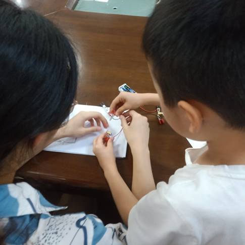 接着,老师带着孩子们组装电路。老师首先演练了串联和并联电路的组装方法。然后,在老师的辅助下,孩子开始自己动手操作。由于第一次接触电路实验,孩子充满好奇,有许多的问题,老师也是十分耐心解答。孩子们通过自己的努力,使小灯泡一个个亮起来,小学员脸上露出新奇和欣喜的笑容。