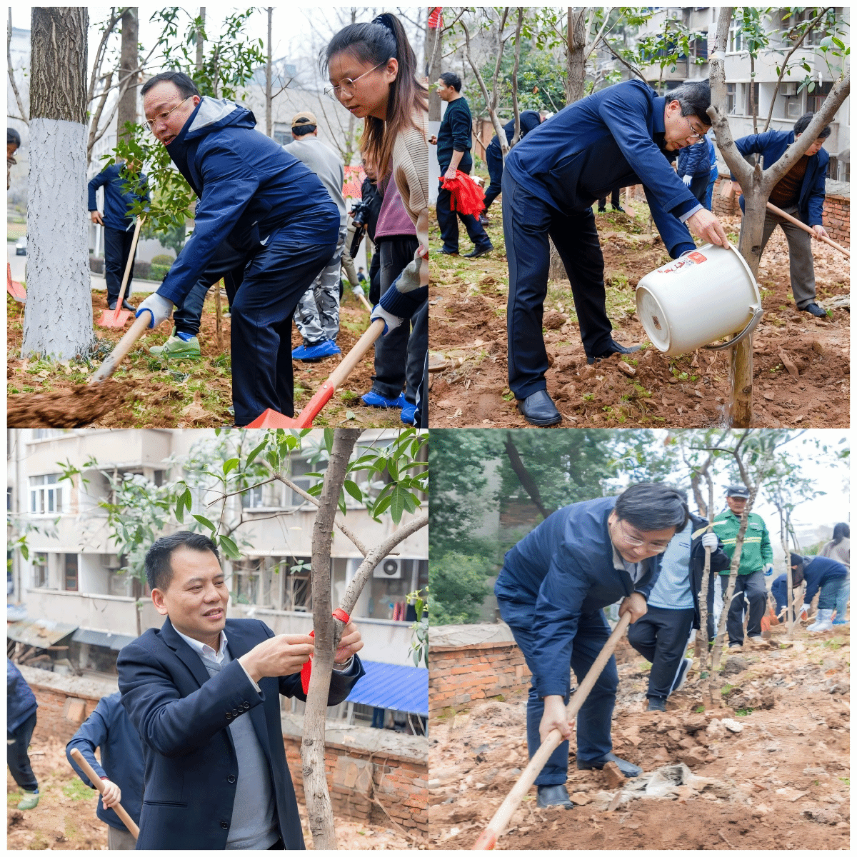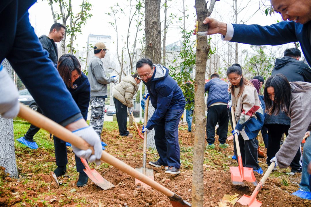 校领导率先拿起工具,投入到植树劳动中,他们挥锹铲土、扶苗填坑、培土浇水,每一个步骤都细致认真。