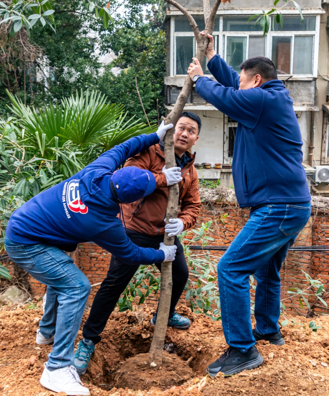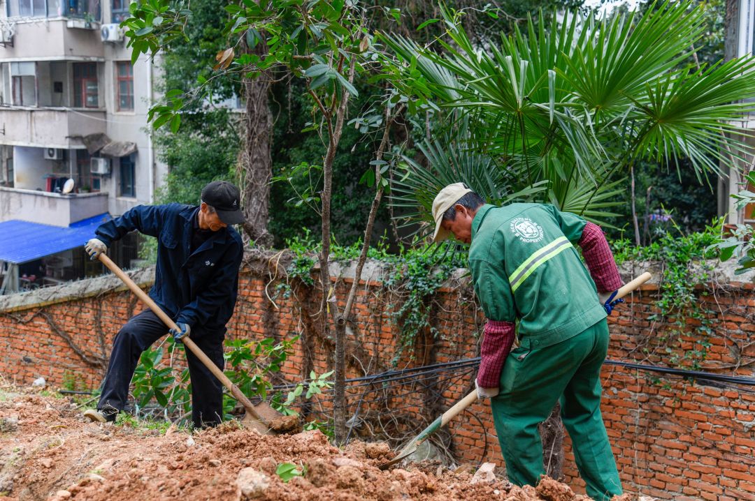 活动现场,宿舍管理与物业服务中心提前准备的80把铁锹、80双手套,还有100棵胸径 3-5cm的小桂花树有序分发到参与者手中。