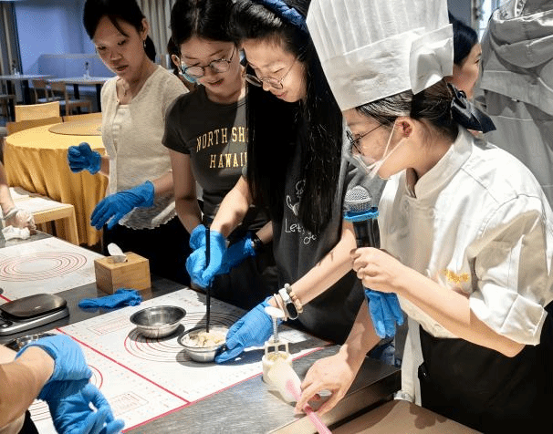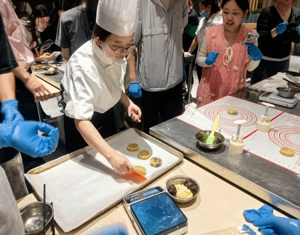 在实践环节,食堂师傅详细演示了月饼制作的全过程——揉团、压平、包馅、压模定型。师生们踊跃参与,互相配合,制作出多个印有“校徽”和“桂香园食堂”字样的月饼。随着香气弥漫整个食堂,金黄油亮的月饼新鲜出炉,师生纷纷拍照留念,或现场品尝,或将月饼精心包装,准备与亲友分享这份独特的节日祝福。
