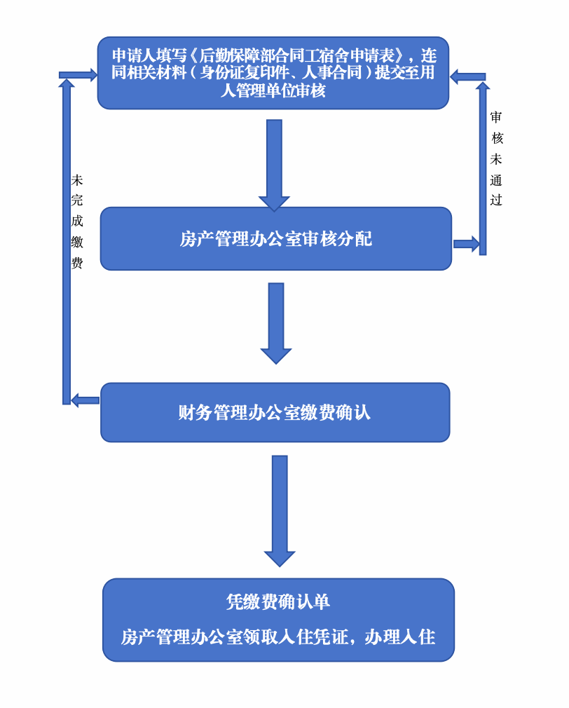 (二)初审通过后,申请人应按表格流程提交至后勤保障部房产管理办公室复核,并确定宿舍与床位、入住时限及应缴管理费;